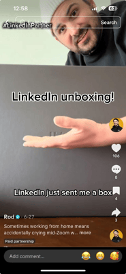Rod Thill brings workplace humor and millennial anxiety to life in short-form formats—sharp sketches set to punchy text overlays and familiar beats of corporate culture. His characters and recurring themes build familiarity. When a brand weaves its way into these relatable setups, it shows up in the world he’s already built.