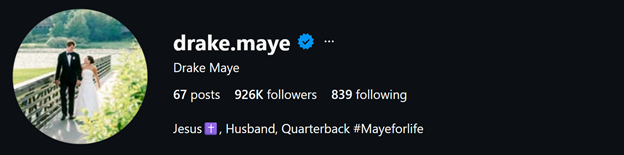 The architect of the New England Patriots’ remarkable 2026 resurgence, Drake Maye has used his sophomore season to become a social media powerhouse. Maye’s digital presence is built on "The Leader" archetype: clean, inspiring, and professional. He utilizes Instagram to showcase his philanthropic work in the New England area while using X for real-time engagement with fans and analysts.