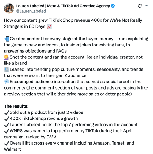Lauren, founder of Lauren Labeled, a Meta and TikTok ad creative agency, demonstrated the power of this approach by growing TikTok Shop revenue 400x for We're Not Really Strangers in just 60 days.